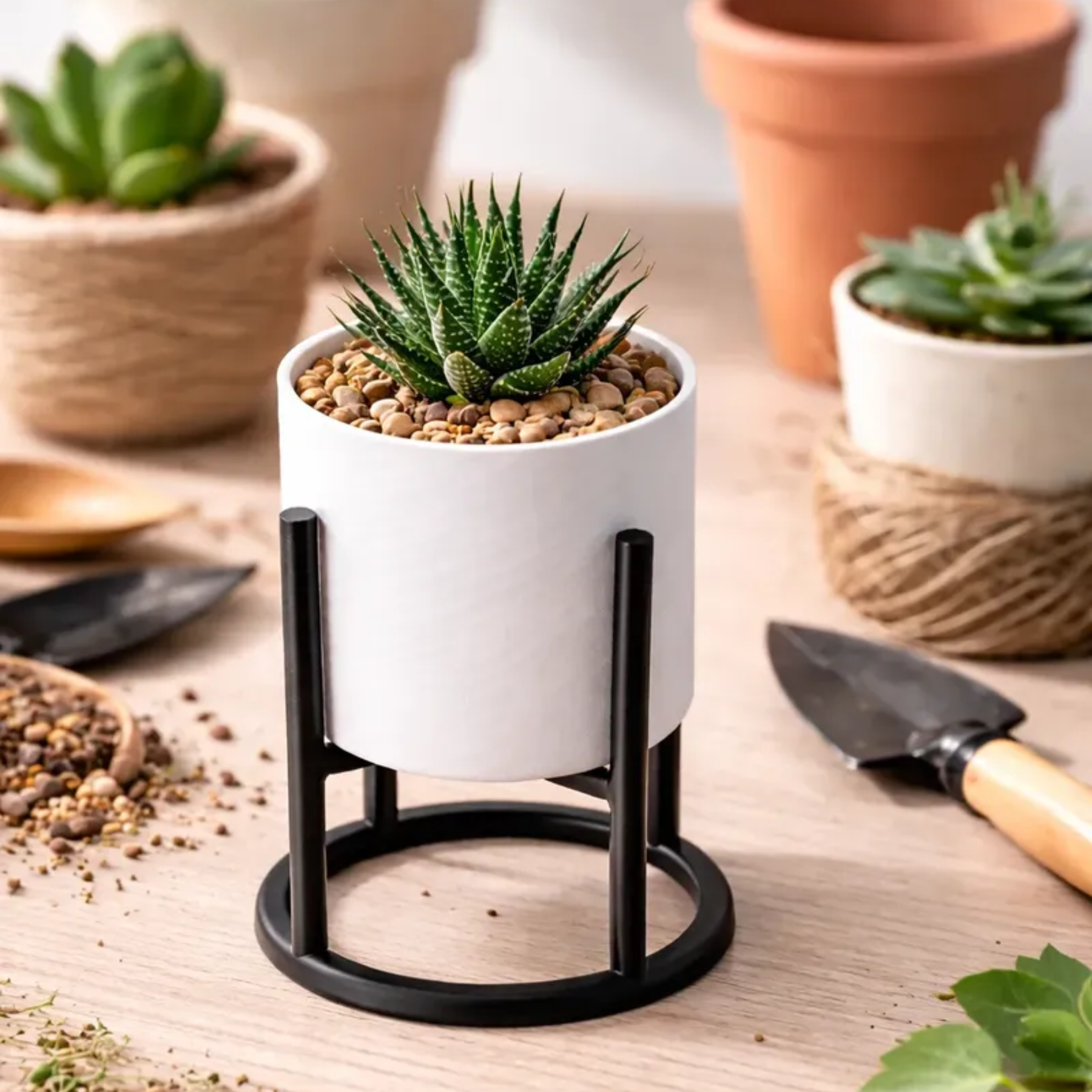 Combinação elegante: vaso branco + suporte preto Ideal para suculentas, mini cactos ou velas decorativas.