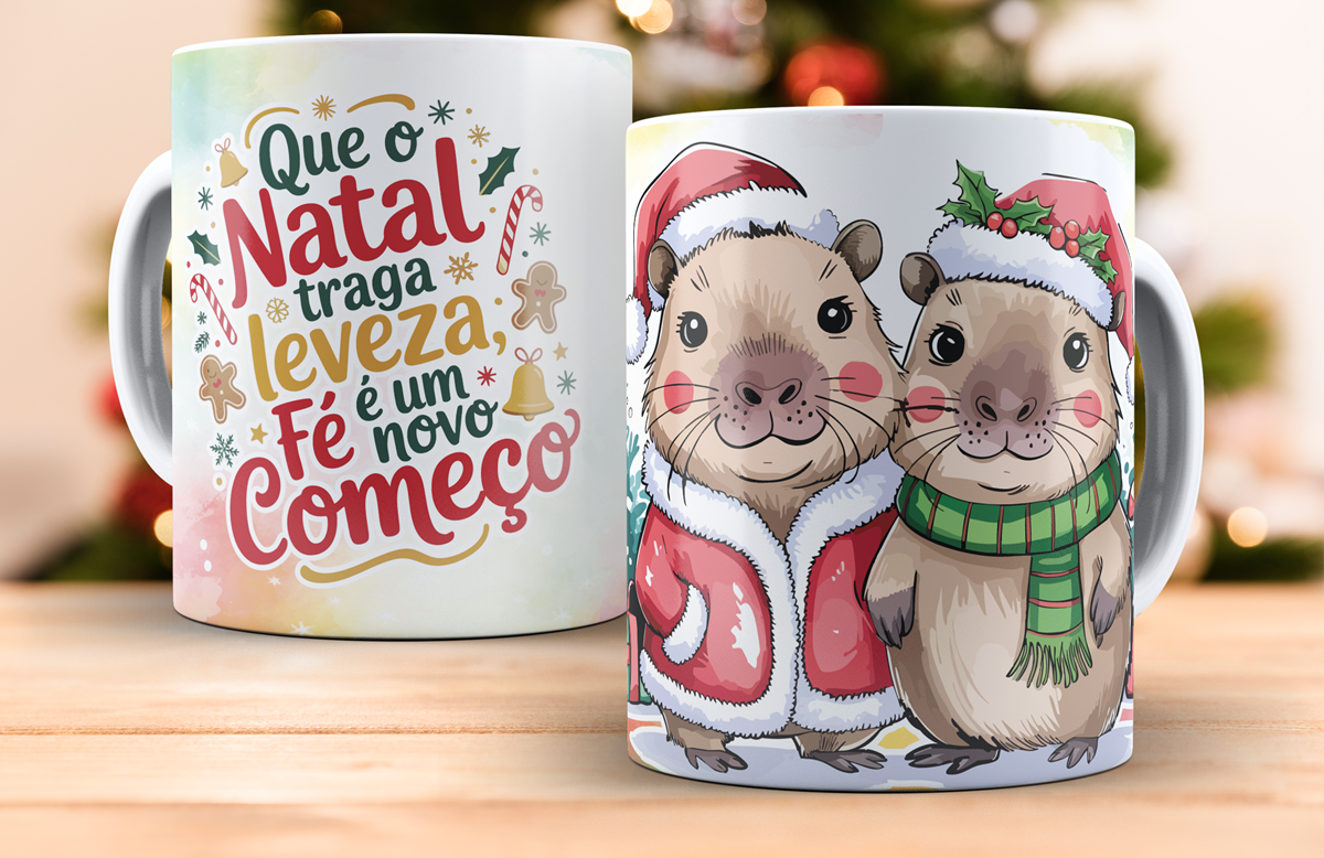1 Caneca Porcelana 325ml Branca - Natal - Leveza, Fé e Novo Começo